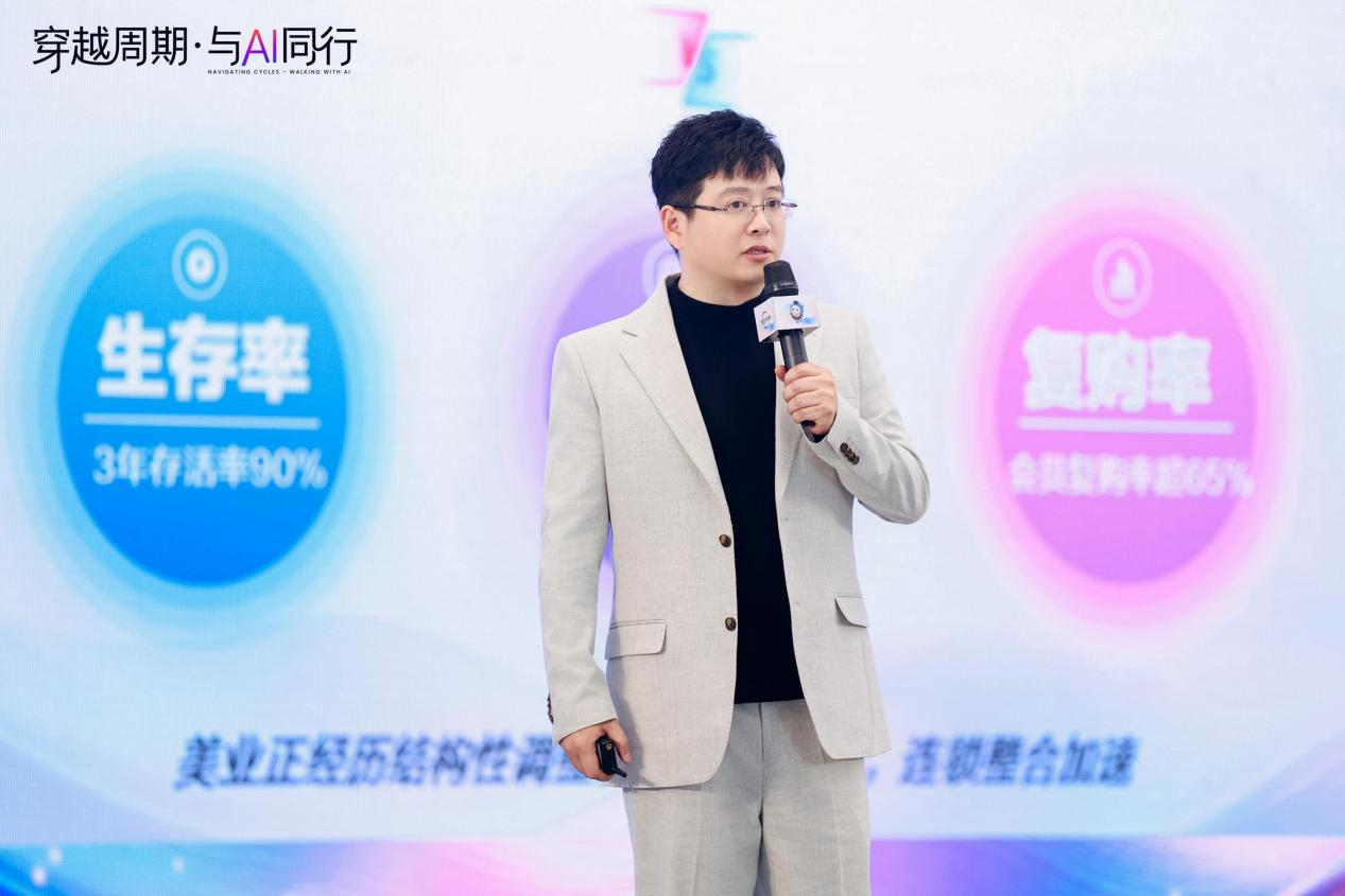 资本、经营、品牌、医美、健康:五位一体的体系化作战 集团副总裁兼CFO周敏指出,美业面临六大挑战,即:合规成本高、获客难、供应链迭代难、组织管理难、数字化建设难和退出壁垒高。面对这些挑战,单打独斗的时代已经过去,抱团共生、平台赋能才是破局的关键。向全国发出寻找100位美业同行者的英雄帖。 副总裁刘静峰提出,抓住情绪价值消费机遇,运用“六脉神剑”经营模型,从纳新到均衡发展,持续提升单店产出。 集团加盟事业部负责人袁冬冬阐释,加盟是“品牌授权”的深化与升级,是“管理体系支撑+业务生态覆盖”的深度赋能,通过“五大护城河”为加盟商提供的是全周期支持与标准化体系,助力单店向体系化作战升维。 秀可儿品牌总监王帅介绍,聚焦医美抗衰,中小美容院通过与秀可儿“双美赋能”合作,实现经营模式、客户价值与资源协同三大跃迁。 启研医疗创始人朱一表示,以开放姿态分享再生医学合作交付和功能医学属地赋能,激活可持续增长,推动美业高质量发展。 从单店挣扎到体系共生:一场关于生存率的真实对话 “美业正在经历结构性洗牌。”集团加盟事业部负责人袁冬冬在《解码加盟,共享品牌穿越周期》的主题演讲中,用一组对比数据点燃了全场关注:行业单店一年存活率约53%,三年存活率仅剩30%;而连锁加盟品牌一年存活率高达87%,三年仍能维持在60%。传统美容院闭店率高达42%,老店客户流失率可达70%。 袁冬冬指出,低价内卷、人才流失、流量枯竭正在压垮独立经营者。美丽田园给出的答案,不是简单的品牌授权,而是一套完整的“管理体系支撑+业务生态覆盖”解决方案。