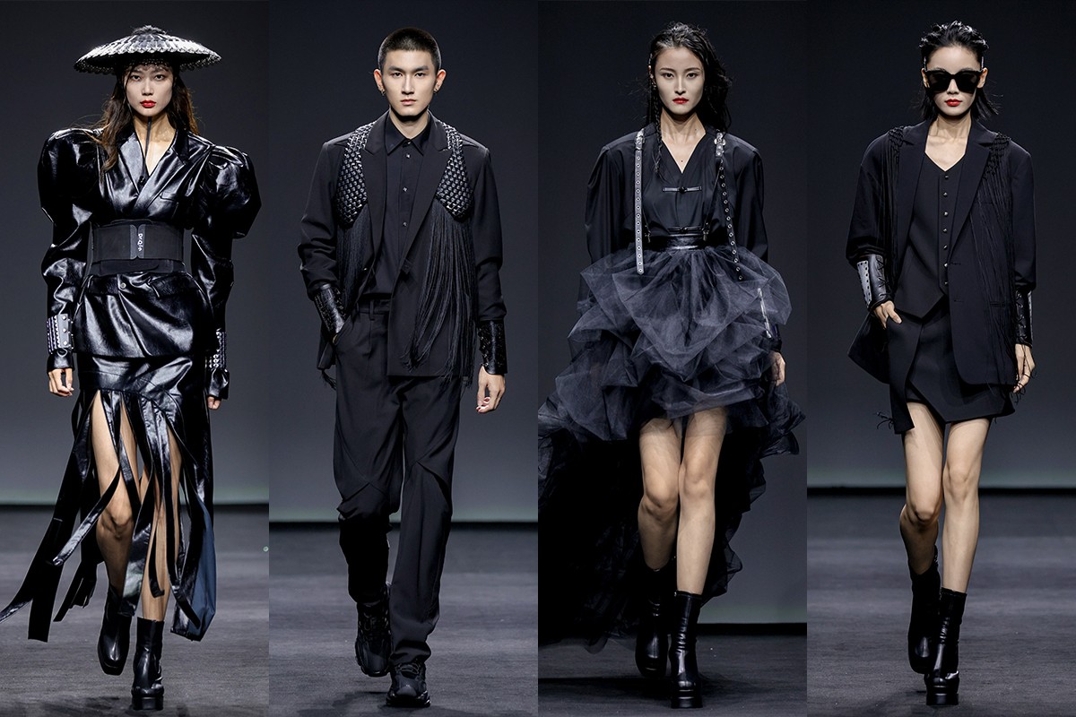 新系列的服装细节以南北朝时期以花木兰为代表的戍边将士身披的甲胄为出发点,将古代铠甲上的金属鳞片与现代时装相串联,把这些鳞片通过特殊的排列固定在皮革面料上面,成为服装上最吸睛的一个部分。传统的龙鳞甲片、锁子甲(一般由铁丝或铁环套扣缀合成片)和祥云云头札甲片在服装中均有体现,值得一提的是山文甲,这种至少在唐代就已经出现的通过甲片与甲片之间互相枝杈咬错成甲的三菱形札甲,甚至不需要一缕丝线。小臂的束袖设计也是来源于铠甲的护腕形状,而上面独特的刺绣设计也将木兰的女性身份做了很好的诠释。锋利的剪裁和回折以及大胆的叠加工艺把独具东方的艺术轮廓拓写地更多元化,虽然在服装中能看到传统云肩图案和刺绣纹样的设计,但ESA从不标榜能多“深刻”地去表达中国文化,在她的作品中我们可以看到新中式与朋克、复古、甚至是鬼马形成冲撞又统一的序列,将女性抽象化的内心力量转化为时装的具象体现。Esa希望通过时装赋予女性主义独立且更个性化的表达方式。